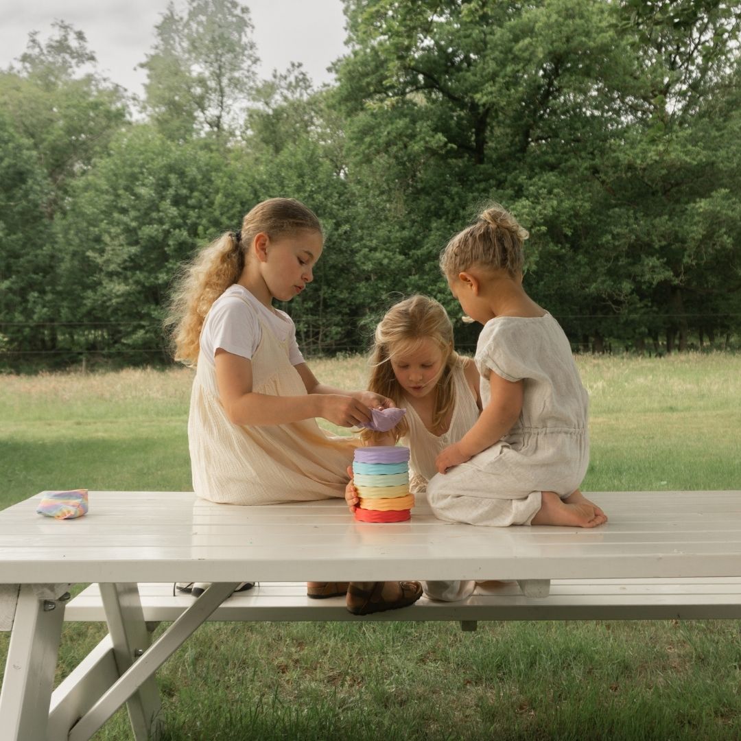 De bakjes zijn stevig, stapelbaar en geschikt voor allerlei soorten open einde spel. Laat je kind kleuren sorteren, rijst overscheppen, zand verdelen of bakjes op elkaar stapelen tot een vrolijke regenboogtoren.