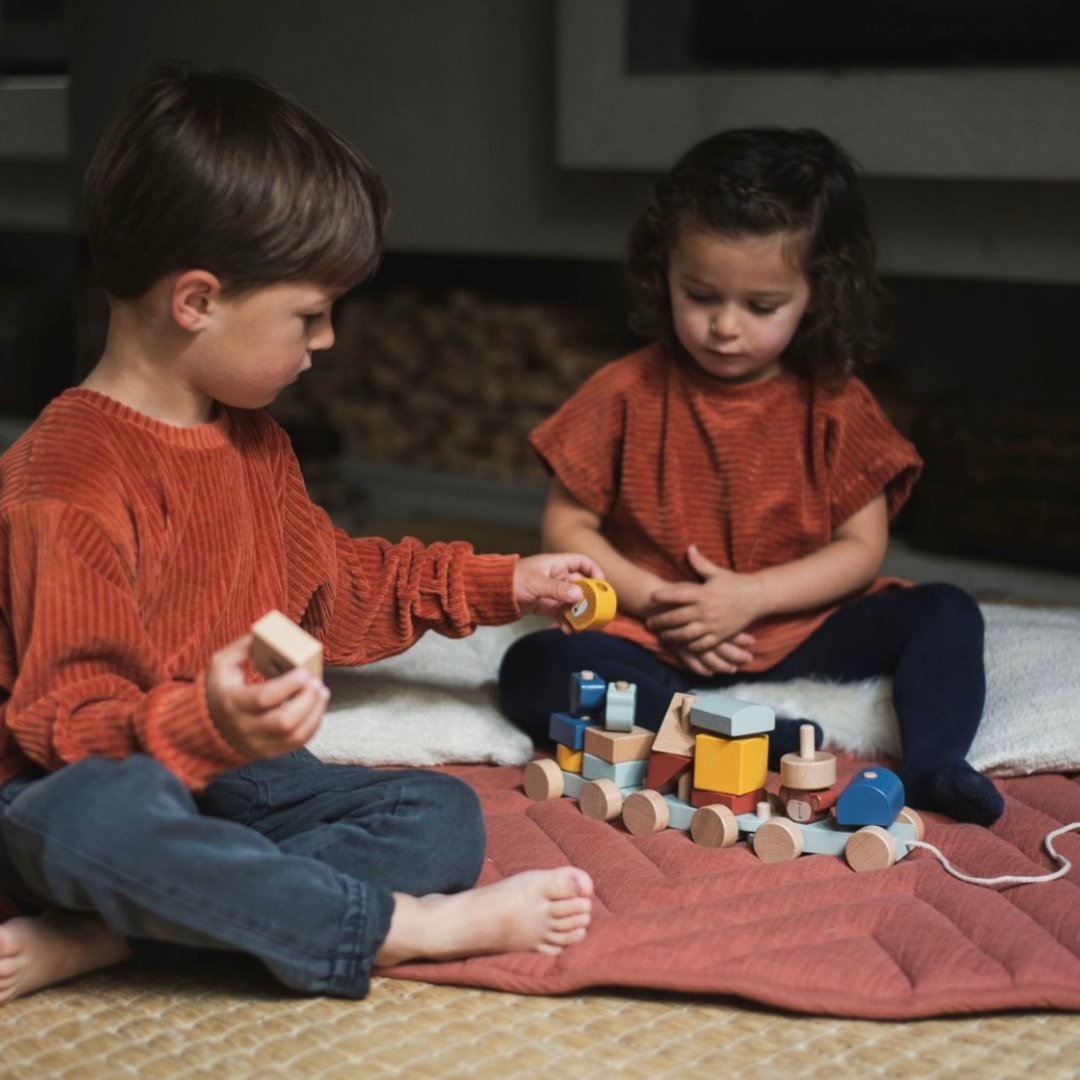 - Materiaal: trein – 100% FSC-beukenhout en MDF, verf op waterbasis; koordje – 100% katoen