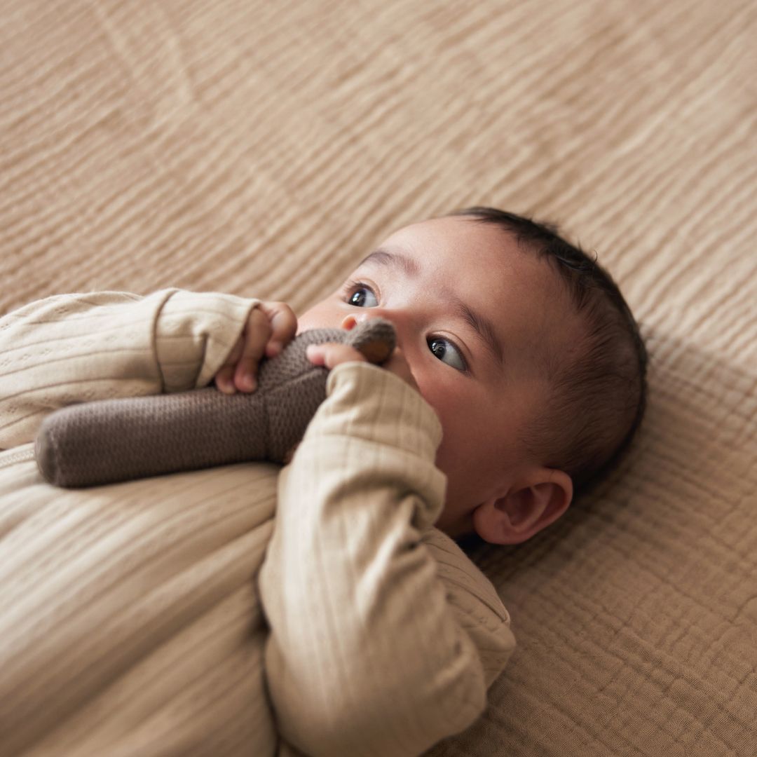 Rammel er op los met dit leuke gebreide ramelaartje. Het schattige dierengezichtje heeft meteen een grote aantrekkingskracht op jouw mini! In het rammelaartje zitten subtiele belletjes verwerkt zodat je kleintje er uren speelplezier van heeft. Nu hoef jij alleen nog maar te kiezen tussen de giraffe, vos en beer.