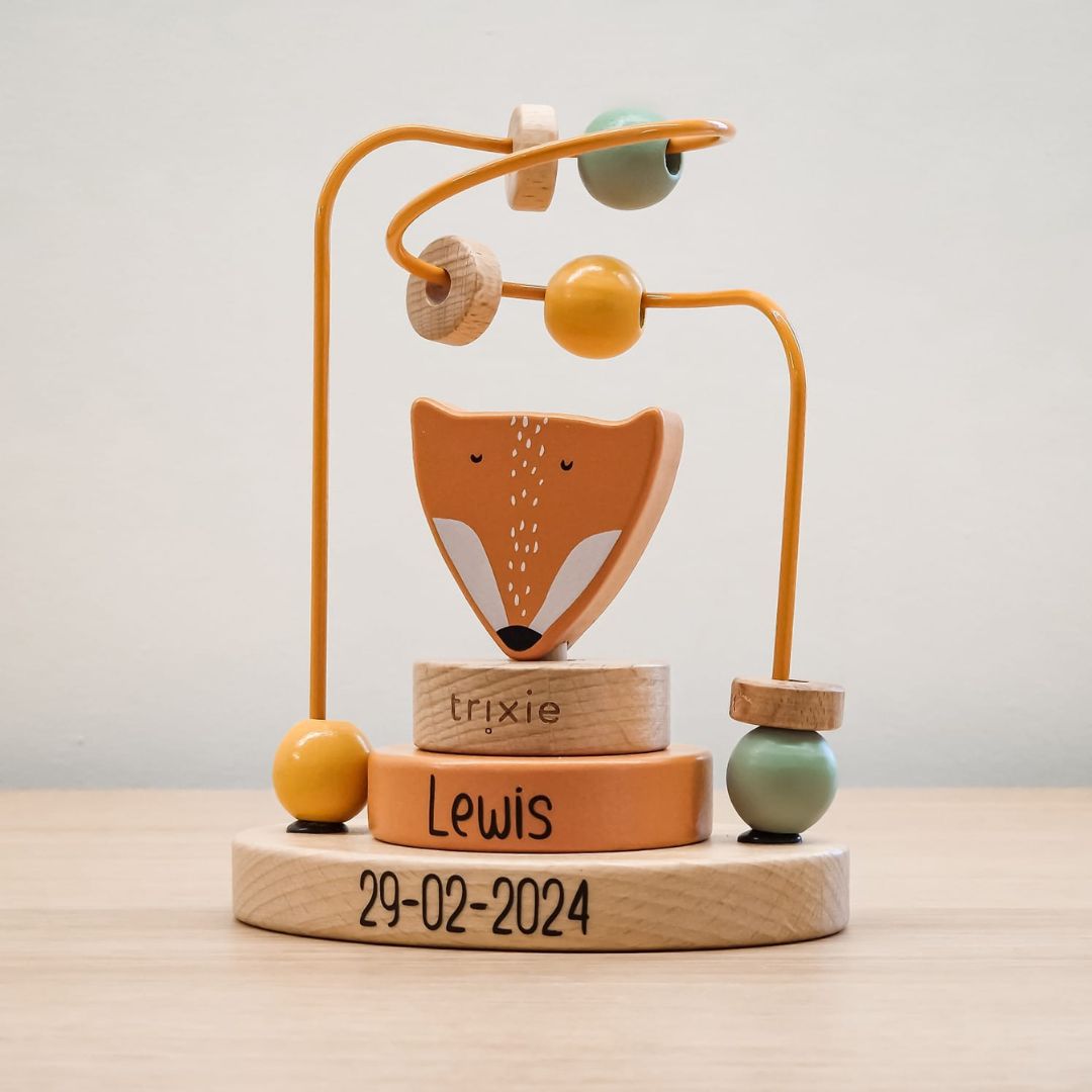 Ben je op zoek naar een leuk en origineel kraamcadeau met naam of cadeau voor een eerste verjaardag? Bij Studio Bambacht kan je het kralenframe van Trixie laten personaliseren met naam en geboortedatum. We personaliseren het kralenframe door er een sticker met de gegevens op te plakken.