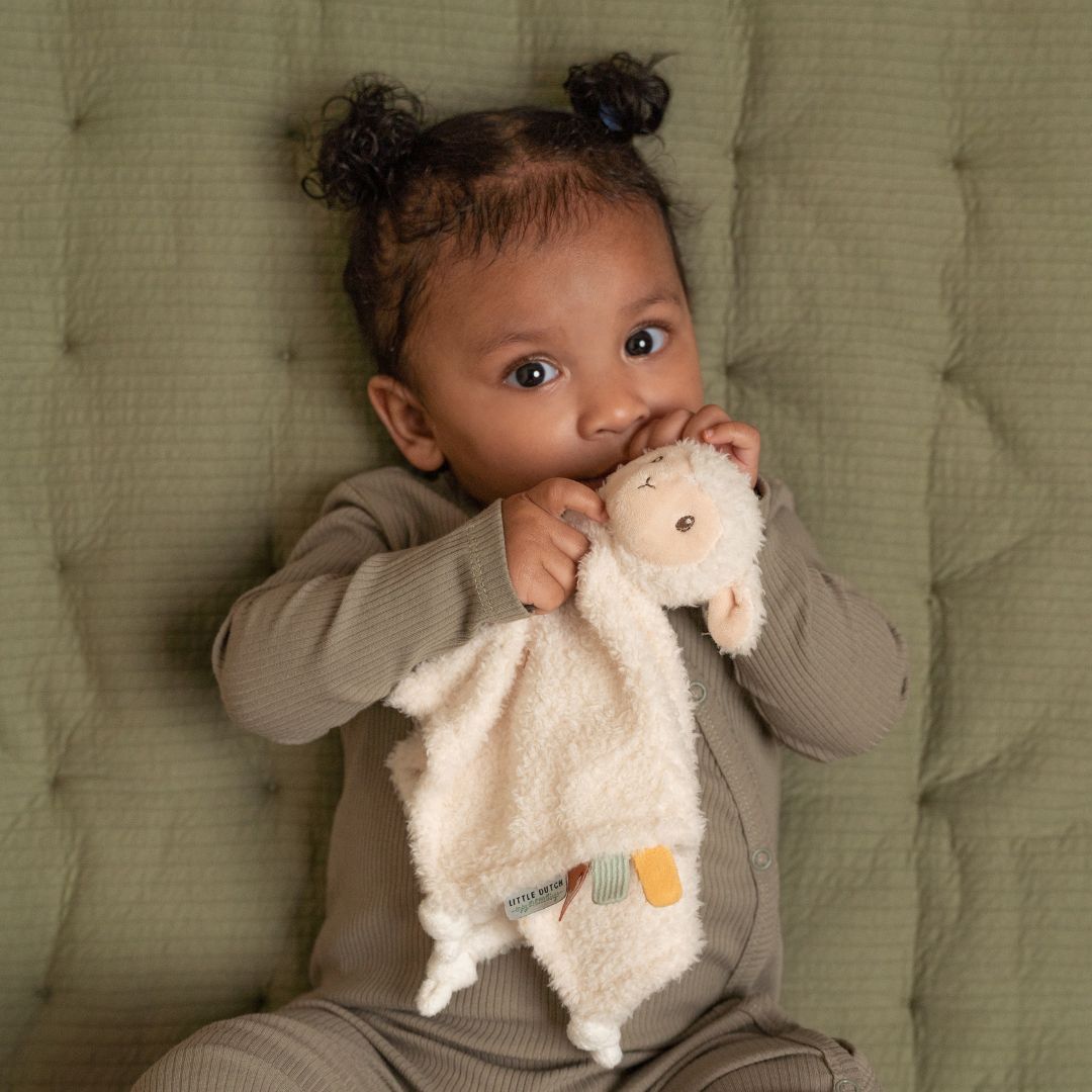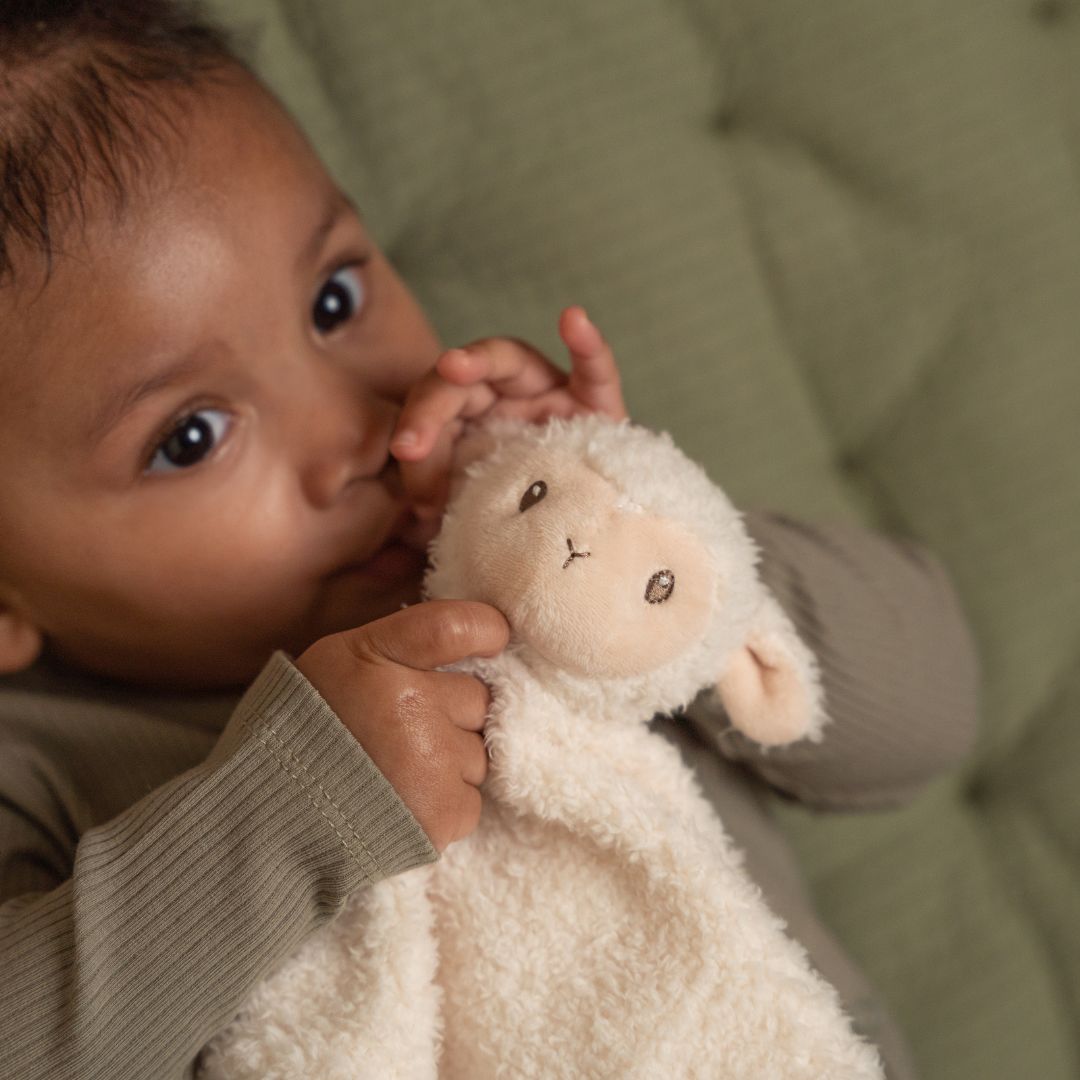 Altijd binnen handbereik. Kindjes hebben dit doekje graag in de buurt. In de box of in de kinderwagen. Deze met een schaapje is afkomstig uit onze Little Farm collectie en biedt vele leuke details om te ontdekken. Denk aan makkelijk vast te pakken leuke labeltjes die de zintuigen prikkelen. De superzachte schaap geeft dit knuffeldoekje een speelse uitstraling.