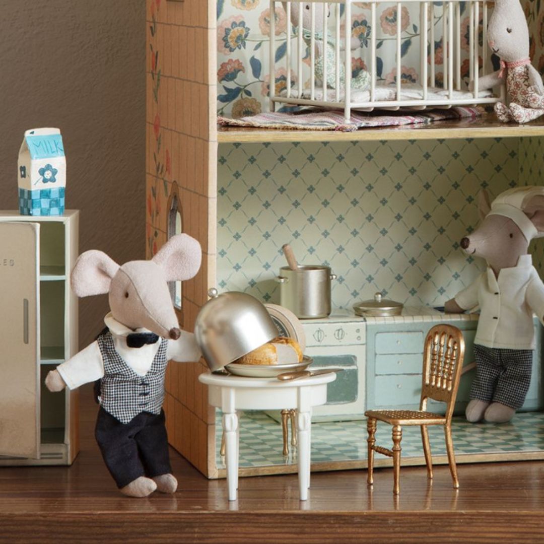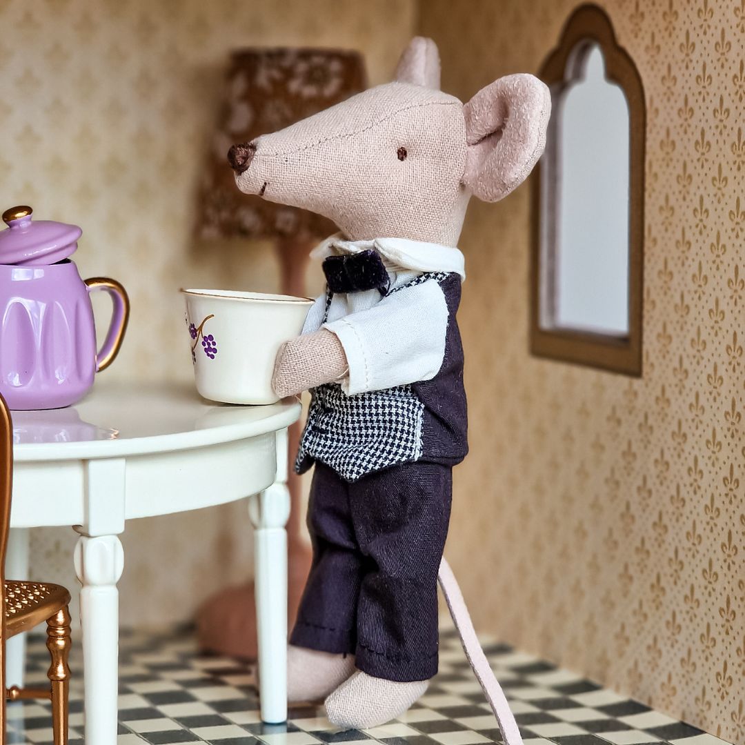 Deze Maileg-muis is altijd keurig gekleed en klaar om je te bedienen! Met zijn nette zwart-witte uniform, vlinderdas en vriendelijke uitstraling is hij de perfecte gastheer in elk muizenhuis. De ober heeft magneten in zijn handen zodat hij makkelijk kopjes kan verplaatsen.