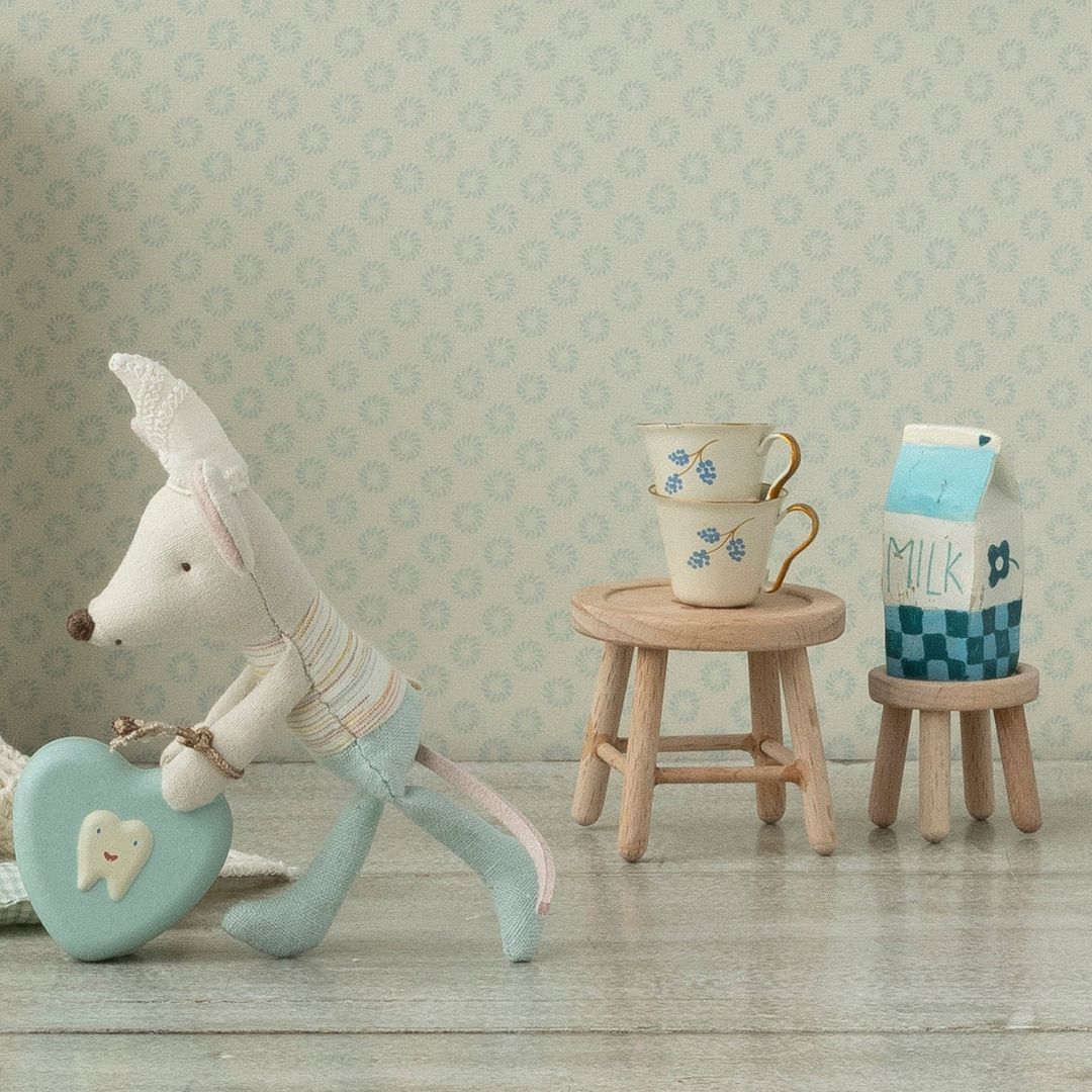 Deze houten bijzettafel en kruk staan mooi in ieder poppenhuis. Het zitvlak en blad hebben de vorm van een knoop. De Maileg-muizen kunnen lekker een kopje warme chocomelk of thee drinken. Zo nodigen de bijzettafel en kruk uit voor nog veel meer opties voor allerlei rollenspellen.