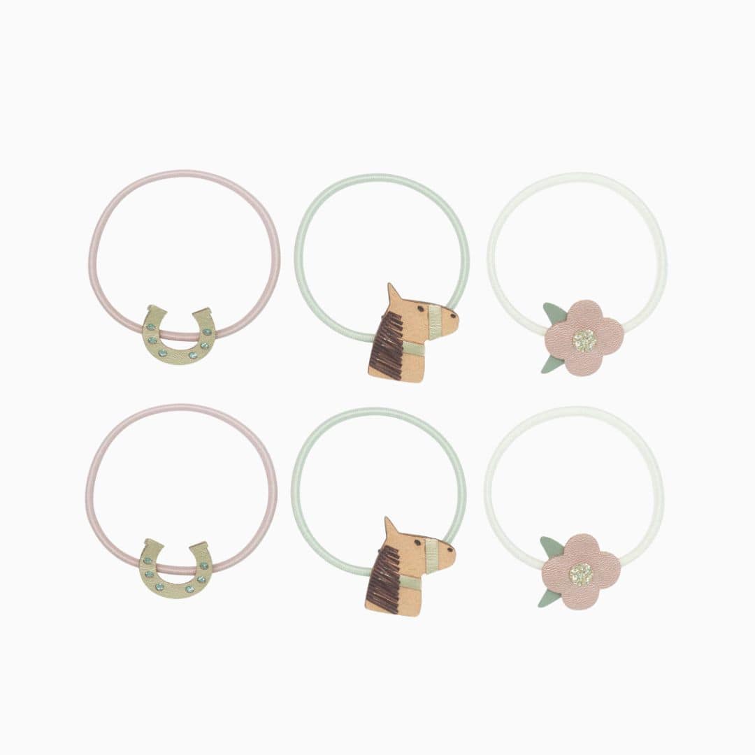 Deze lieve elastiekjes houden de paardenstaarten, vlechtjes of knotjes van jouw paarden-liefhebber bij elkaar. Deze set van Mimi & Lula bestaat uit zes kinderhaarelastiekjes met kunstlederen paarden, bloemen en hoefijzers.