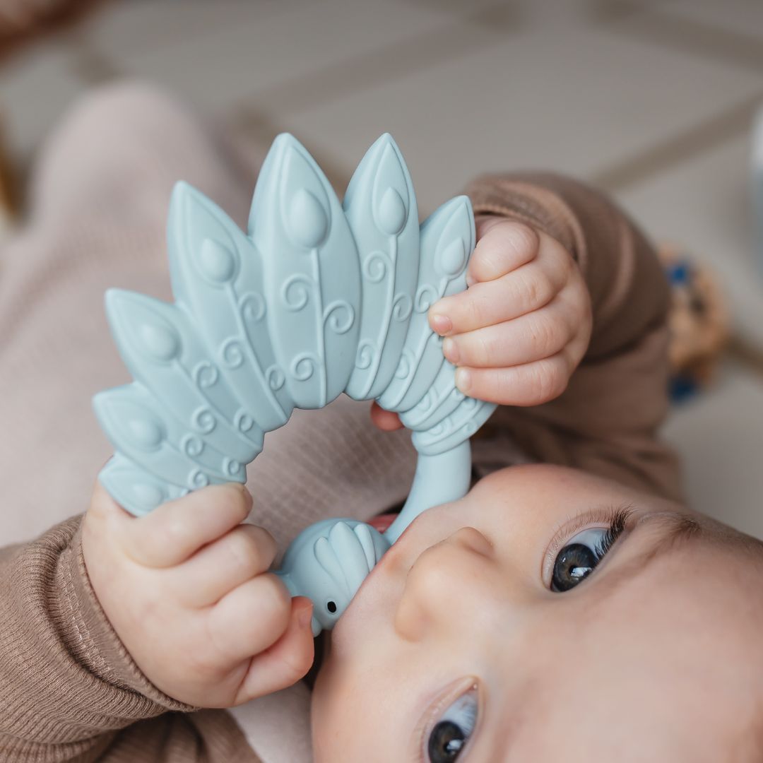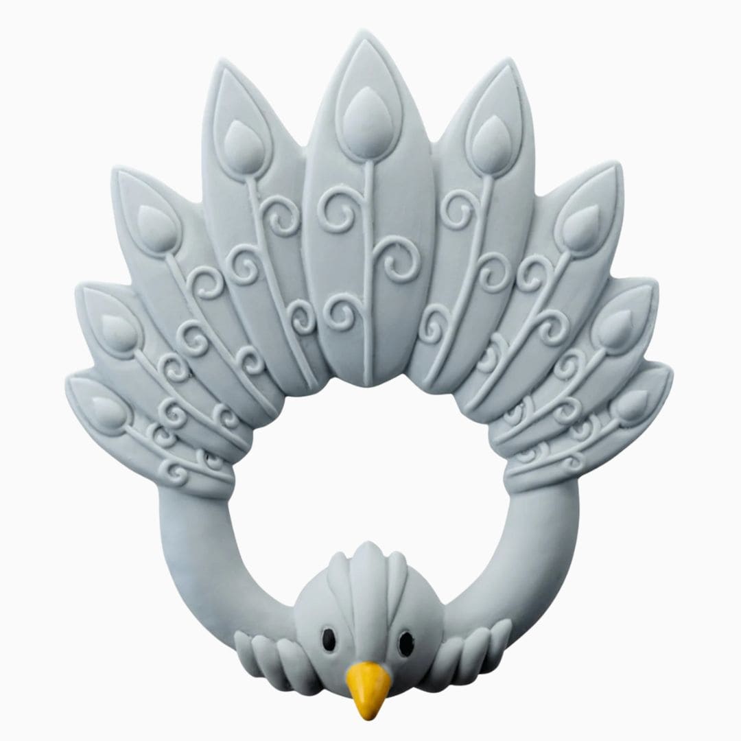 Deze prachtige bijtring van Natruba masseert het tandvlees en verlicht zo de pijn bij het doorkomen van de tandjes. De pauw is voorzien van verschillende reliëfs en oppervlaktes om de zintuigen van je kindje te prikkelen. De bijtring is gemaakt van 100% natuurrubber en vrij van BPA, PVC en ftalaten.