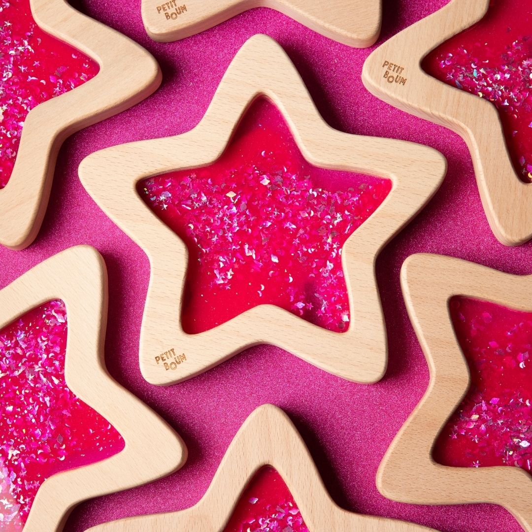 De sensorische ster van Petit Boum is gevuld met kleurrijke roze vloeistof, glitter en fluorescerende vloeistoffen die oplichten in het donker. Draai of beweeg de sensorische ster en zie hoe de vloeistoffen en glitters zich verspreiden. De fluoriserende elementen laden op in het daglicht en lichte op als het donker wordt.