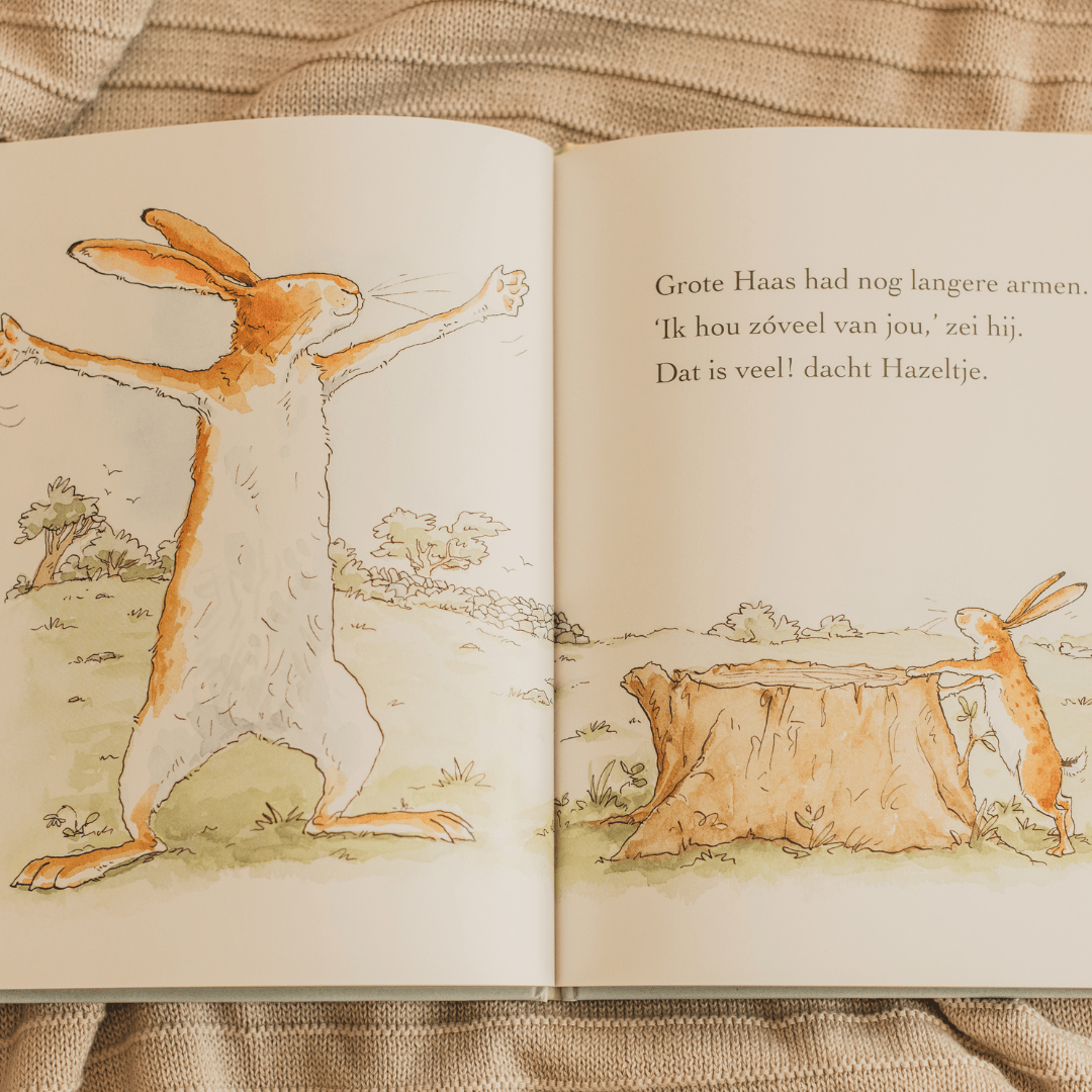 Hazeltje en Grote Haas houden vreselijk veel van elkaar. Maar hoeveel precies dat is niet makkelijk te maken meten! Hazeltje vertelt Grote Haas hoeveel hij van hem houdt door o.a. zijn armen zo ver mogelijk te spreiden, zijn handen zo hoog mogelijk boven zijn hoofd te reiken en zo hoog mogelijk te springen… Telkens als Hazeltje iets bedacht heeft, doet Grote Haas daar nog een schepje bovenop.